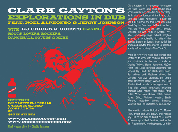 -Clark wields a gargantuan Sousaphone (big fat tuba) and belts out chakra-bustin' basslines w/ an all-star ensemble performing an experimental live blend of Reggae, Jazz, Ska, and psychedelic Dub. Sample some @ www.clarkgayton.com with DJs Chicus, Mikey Assassin, DRM FRIDAY JUNE 16th @ SPUTNIK 262 Taaffe Pl @ Dekalb Brooklyn G train to Classon - 1 block $5 after 12 $4 red stripes all night |